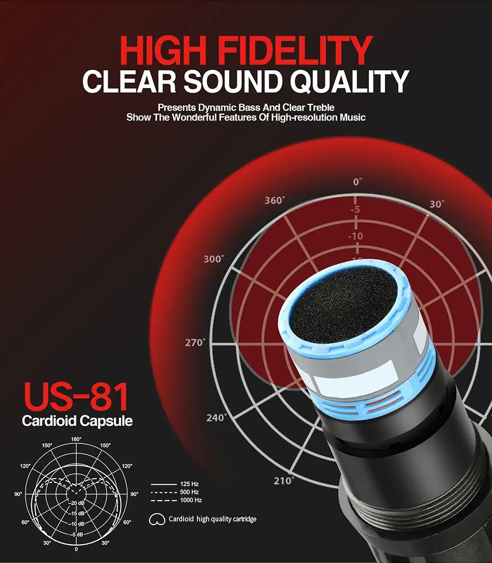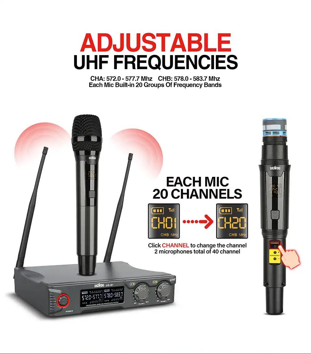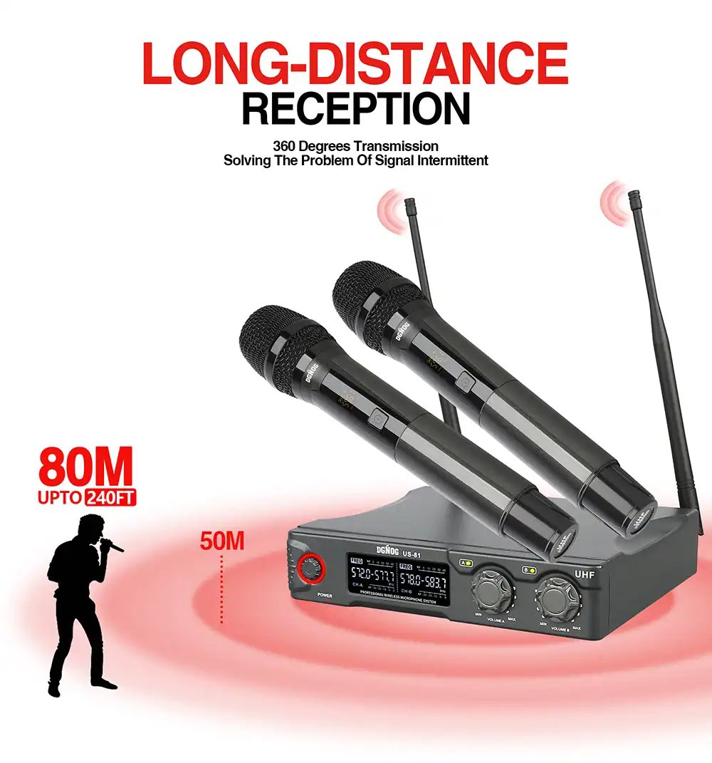 【Great Signal Stability】Each UHF microphone has 20 adjustable frequencies for long distance transmission in open space (265 ft). A steady signal from the microphone will ensure your performance.