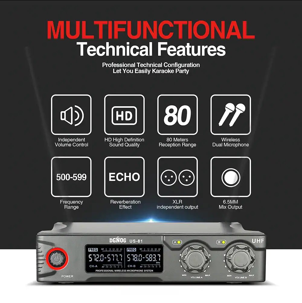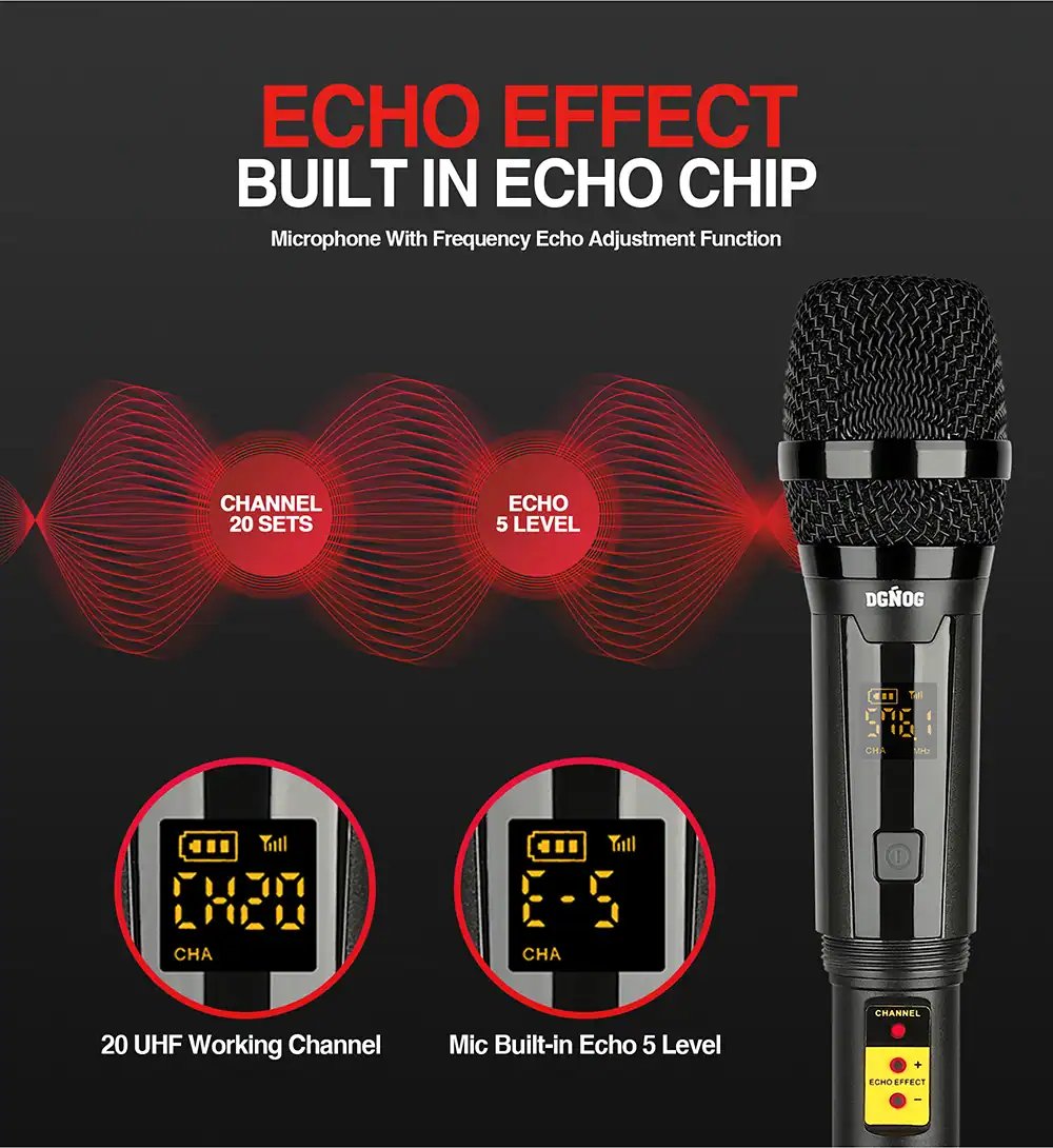 【LASTEST WIRELESS MICROPHONE】Adopt Professional-Level cardiac dynamic capsule. More outstanding, clear, pure, full sound, eliminate background noise and howling. Suitable for karaoke, family KTV, large parties, DJ, wedding, lecture, teaching use.